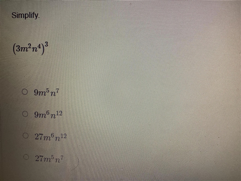 You can solve this by looking at the exponent (3) outside of the parenthesis. Then you multiply the exponent and all of the numbers inside of the parenthesis and get your answer.