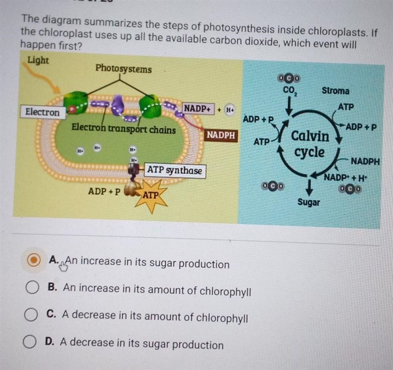 Explanation: Photosynthesis is the process by which plants, algae, and some bacteria convert light energy from the sun into chemical energy stored in the form of organic molecules, such as glucose. Carbon dioxide is one of the key reactants required for this process, and if the chloroplast uses up all the available carbon dioxide, the rate of photosynthesis will decrease. This is because without enough carbon dioxide, the Calvin cycle, which is the part of photosynthesis that produces glucose, will slow down. As a result, there will be a decrease in the production of sugar in the chloroplast.