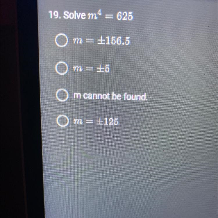 ![+/-\sqrt[4]{m^4}=+/-\sqrt[4]{625} \\m=5\\m=-5](https://img.qammunity.org/2024/formulas/mathematics/high-school/l12pxmtm8ltlsebzy9nzb1966nnng8f2aw.png)