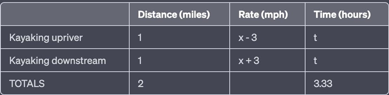 4) The kayakers are paddling at a speed of 3.599 miles per hour. This solution is obtained by calculating the average speed of the kayakers over the entire trip, taking into account the opposing speed of the river current. The kayakers are traveling faster downstream (with the current) than upstream (against the current).