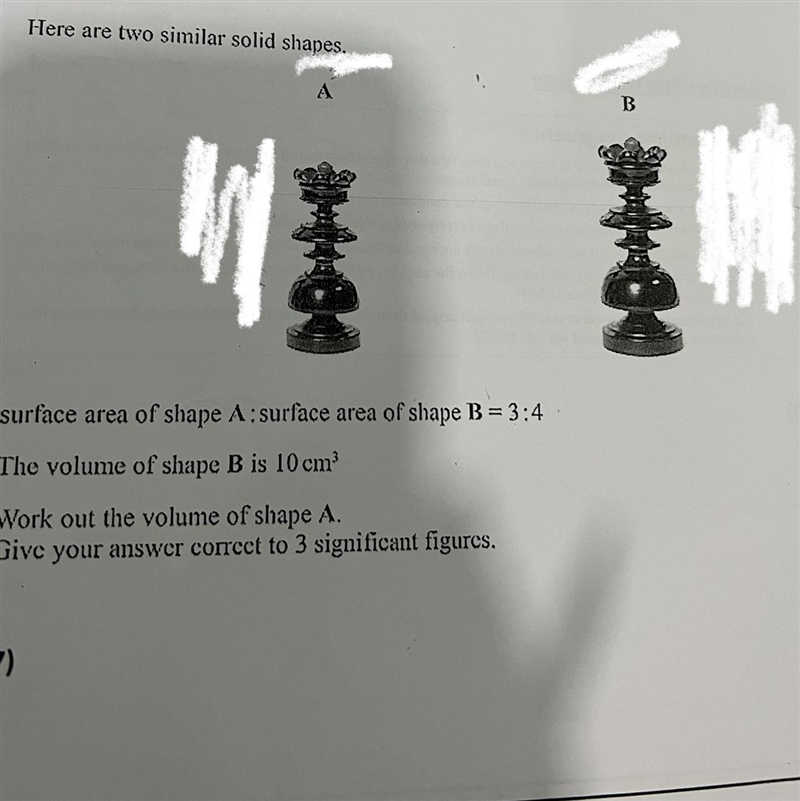 We know that the volume of shape B is 10 cm³, and we can find the volume of shape A by using the ratio of the volumes to the ratio of the surface areas: