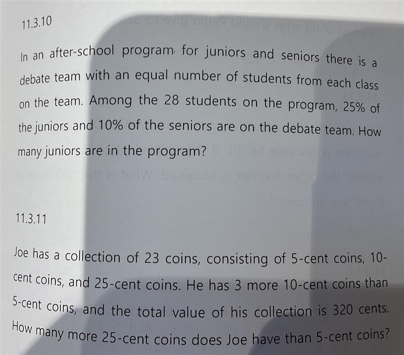 5x+10y+25z=320 which is also x+2y=5z=64. You can subsitute y for x+3 because he has 3 more 10-cent than 5-cent. x+x+3+z=23 which is 2x+z=20=z=20-2x.