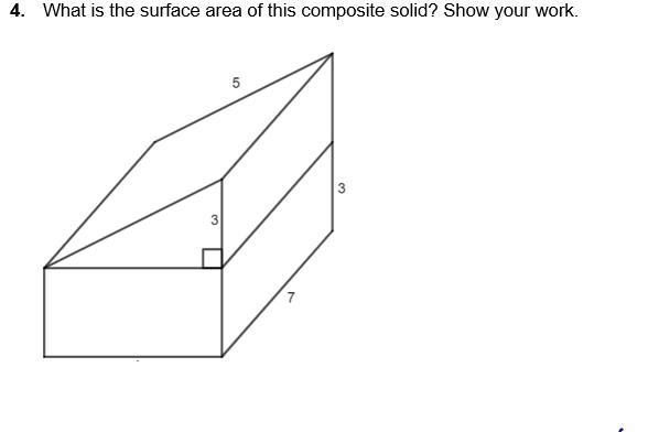 The lateral area is the product of the height of the prism (7) and the perimeter of the base. The vertical edges of the base are 3 and 6, the horizontal edge is 4 (see above), and the slant edge is shown as 5. This means the perimeter is 3+6+4+5 = 18 units.