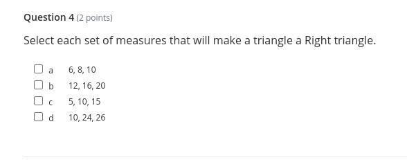 Therefore, the sets of measures that will make a triangle a right triangle are a) 6, 8, 10 and d) 10, 24, 26. The answer is (a) and (d).