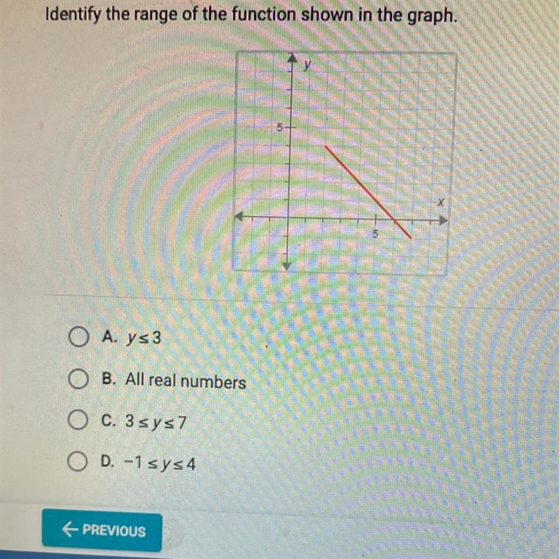 Identify the range of the function shown in the graph. A. ys3 OB. All real numbers C. 3 sys7 D. -1 sy≤4 5- 5
