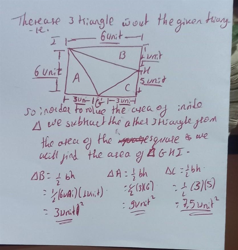 area of triangle GHI = 36 unit^2 - ( 3+9+7.5) unit^2