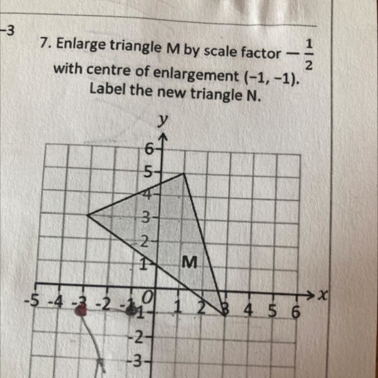 With the center of enlargement then found on plotted axis (-1, -1), one would find a new triangle labeled N.