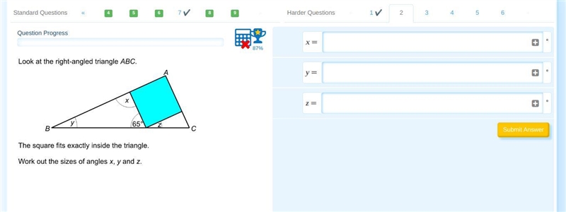 the angle b/n z and 65 is 90 b/c its a square and they are found on a straight line (180)