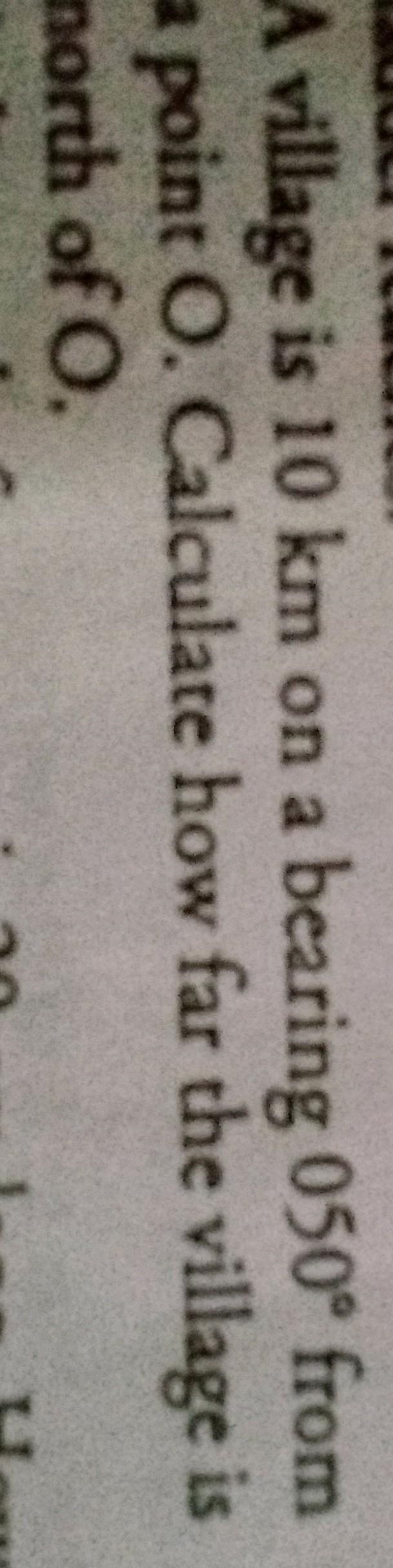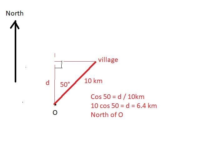 Calculate how far the village is north of O