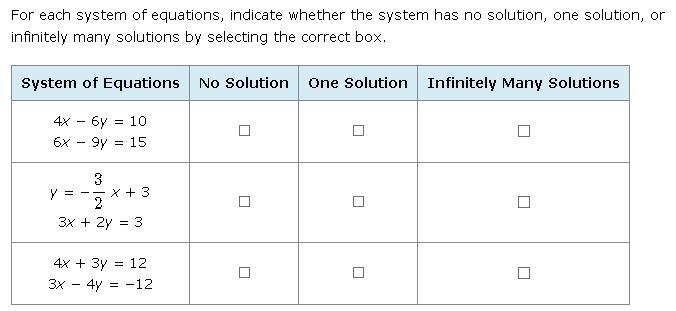 You want to determine the number of solutions to three different systems of equations.