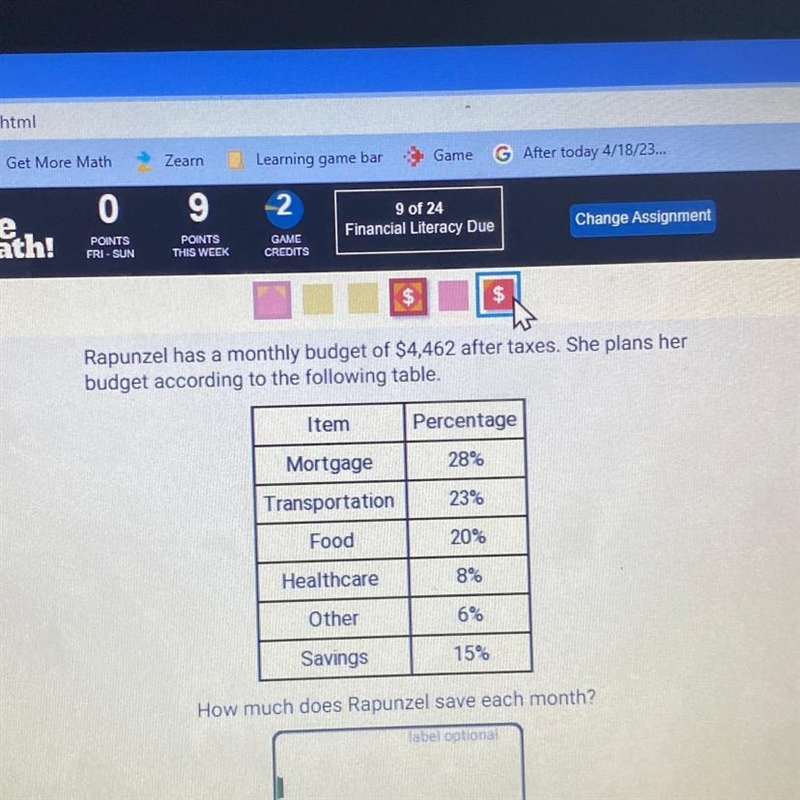 You want to know the amount Rapunzel saves each month if she saves 15% of her $4462 monthly income.