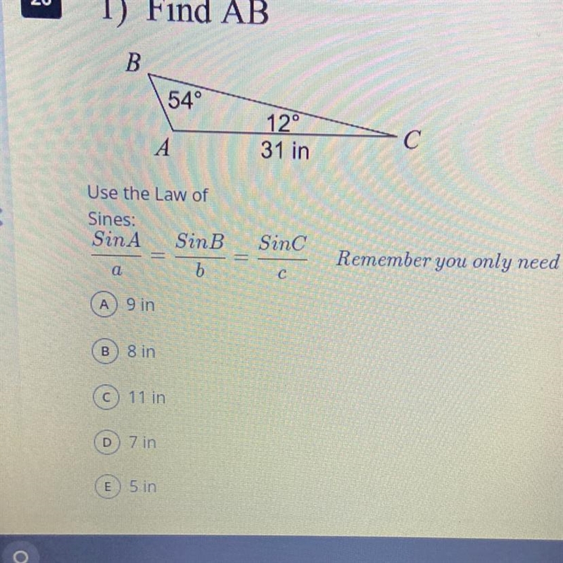 1) Find AB B A 9 in Use the Law of Sines: SinA a (0) 8 in A 54° 11 in D 7 in 5 in SinB b 12 31 in SinC C Remember