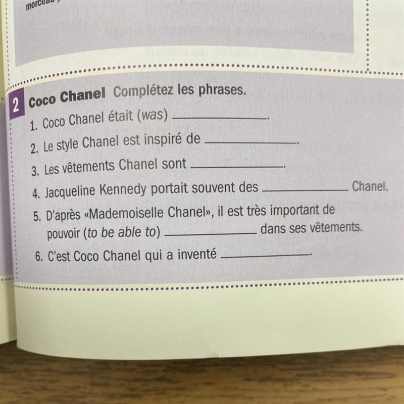 2 Coco Chanel Complétez les phrases. 1. Coco Chanel était (was) 2. Le style Chanel-example-1
