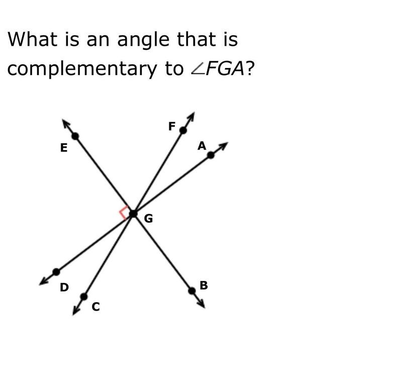Step-by-step explanation: Angle EGF is complementary to FGA because the two angles add up to 90 degrees, which is what it means to be complementary.