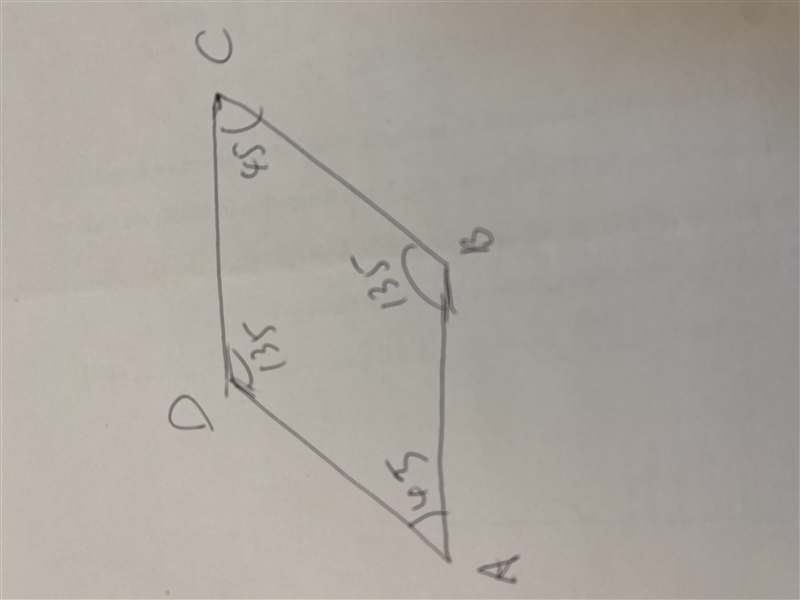 Constrict a quaderateral that has 2 pairs of parallel sides and at least 2 angles mesuring 45 deggres and 135 degrees label all angle side lengths what did you draw? PLEASE HELP…