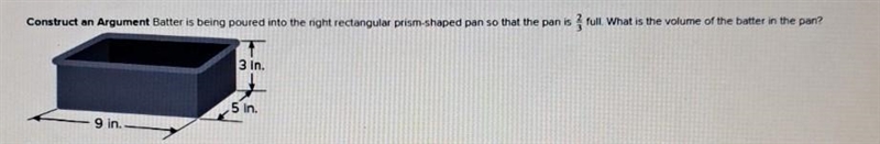 Therefore, the volume of the batter in the pan is 135 cubic inches. This argument is valid because it follows the basic formula for calculating the volume of a rectangular prism and uses the specific measurements provided for the length, width, and height of the pan.