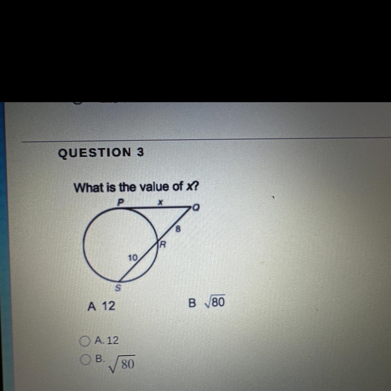 You want to know the length of tangent PQ, given that secant QS has segments QR = 8 and RS = 10. Points P, R, and S are on the circle. Point Q is external to the circle.