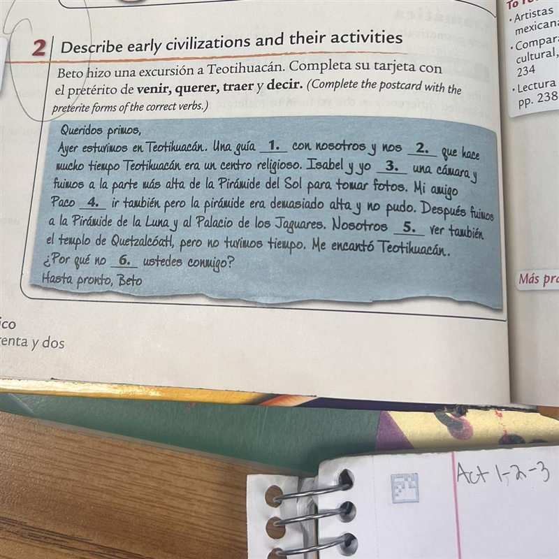 PLEASE HELP! Beto hizo una excursión a Teotihuacán. Completa su tarjeta con el prétérito de venit, querer, traer y decir. (Complete the posteard with the preterite forms of the …