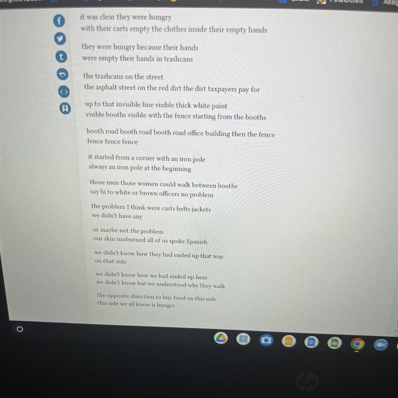 - Imagery: "with their carts empty the clothes inside their empty hands", "the trashcans on the street", "the asphalt street on the red dirt"