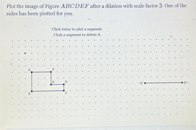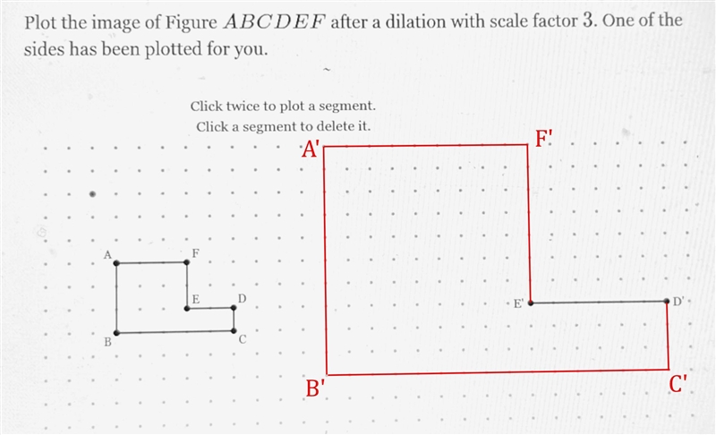 Dilation by 3 means that you increase the length of each of the sides by 3. Since ED was 2 units long, the plotted dilation of ED is 6 units long. By multiplying each of the lengths of the sides by 3 units, you will be able to draw the whole image.