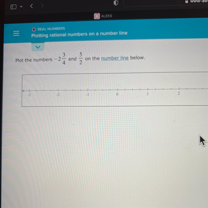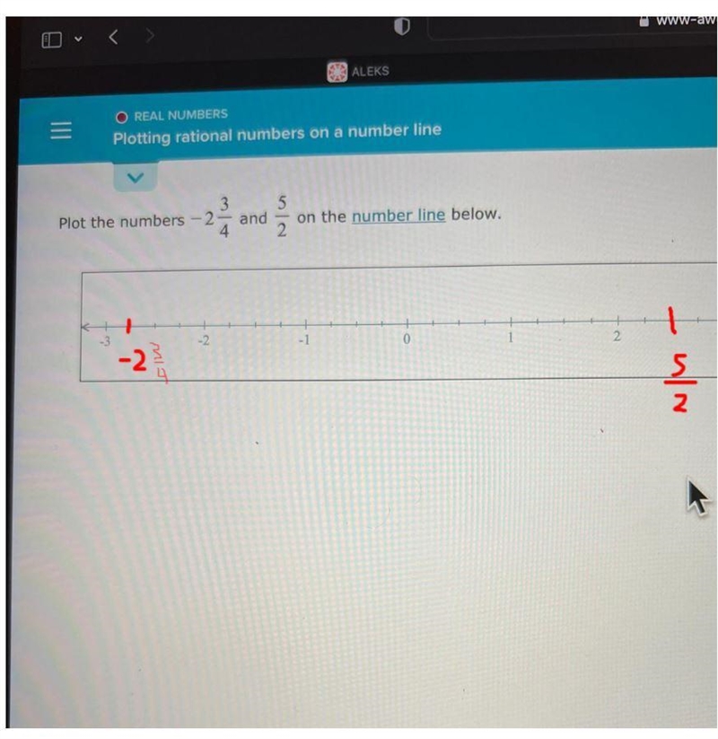 Plot the numbers -2 3/4 and 5/2 on the number line below.-example-1