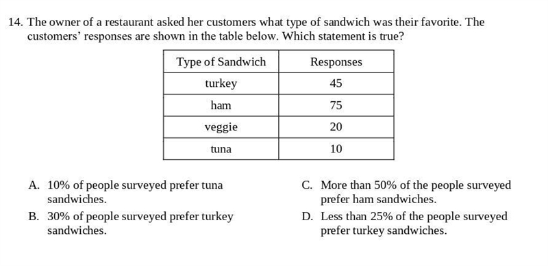 45/150 = 30% of the people surveyed prefer turkey sandwiches.