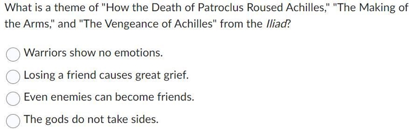 What is a theme of "How the Death of Patroclus Roused Achilles," "The Making of the Arms," and "The Vengeance of Achilles" from the lliad?