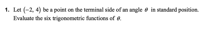 We can use the given point (-2, 4) to find the values of the trigonometric functions for the angle in standard position that has its terminal side passing through that point.