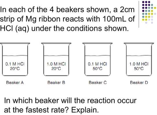A higher concentration of HCl would mean more HCl avaliable to react with the magnesium strip. In addition, the reaction occurs faster at a higher temperature as the molecules move around faster and have a higher chance of colliding with the correct orientation. Therefore, the answer is Beaker D.