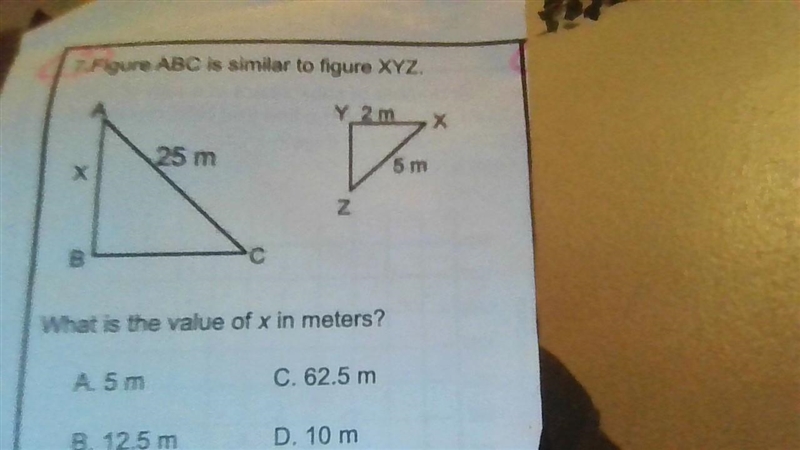 On XYZ, 2 m is another side that is given. If we multiply by our constant, 5, we will get 10. Therefore, the answer is D.