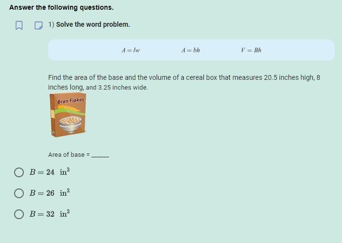 It’s 26, no? Because if you have the length and the width of the box you just multiply is and ignore the height to get the area of the base so it’s 8(3.25)=26u^2