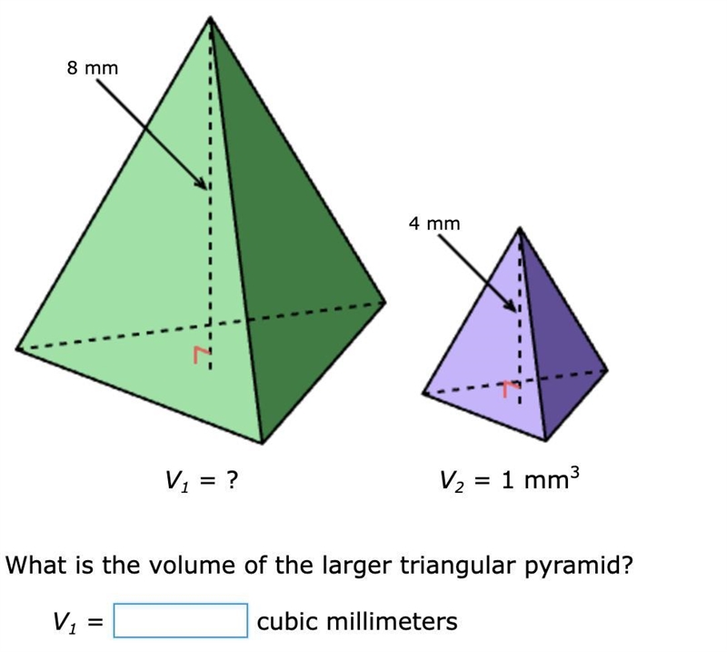 Larger pyramid volume = 8 x 1 = 8 cubic millimeters