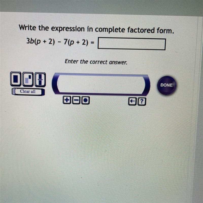 3b(p + 2) - 7(p + 2) ← factor out common factor (p + 2) from each term