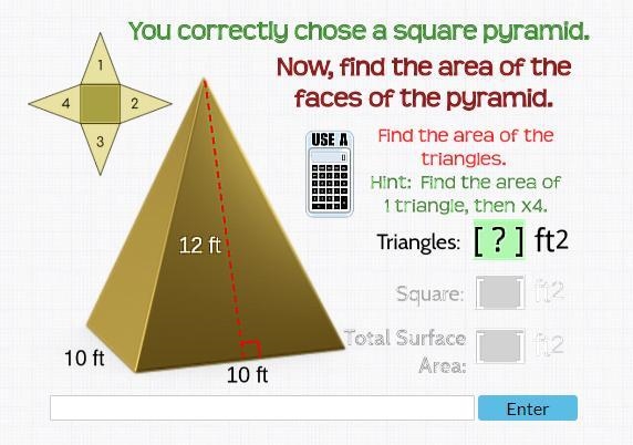 You want the face area, base area, and total area of the square pyramid with base edges 10 ft and slant height 12 ft.