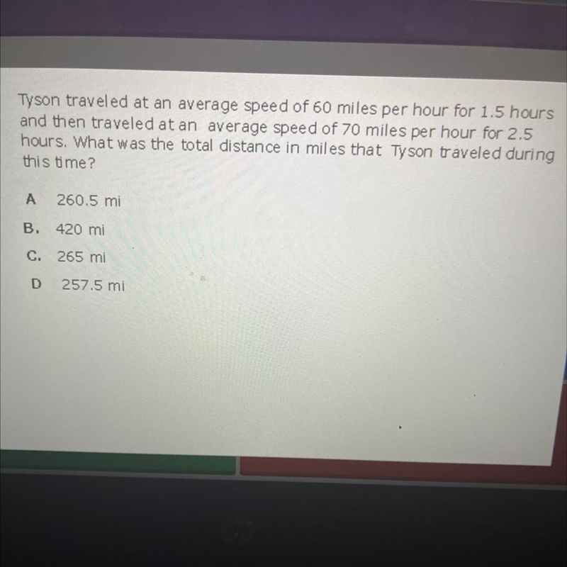 To calculate the total distance Tyson traveled, we need to use the formula: distance = speed x time. First, we calculate the distance traveled during the first segment at 60 mph for 1.5 hours: distance = 60 x 1.5 = 90 miles. Then, we calculate the distance traveled during the second segment at 70 mph for 2.5 hours: distance = 70 x 2.5 = 175 miles. Adding these two distances together, we get: 90 + 175 = 265 miles. Therefore, the answer is C, 265 miles.