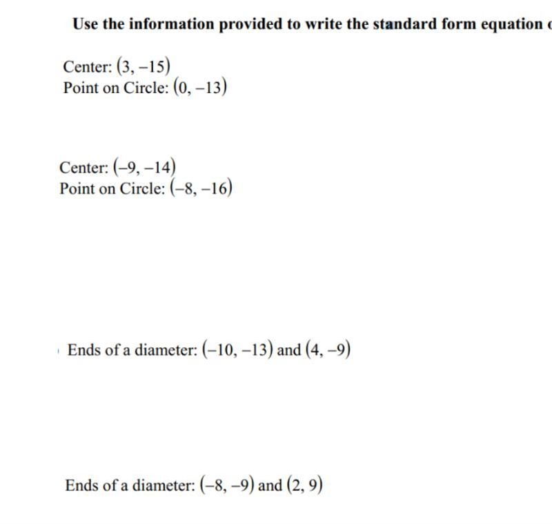 . In the first problem, the x1 would be -10, the y1 would be -13. The x2, on the other hand, is 4 and the y2 is -9. Now find the center of the circle.