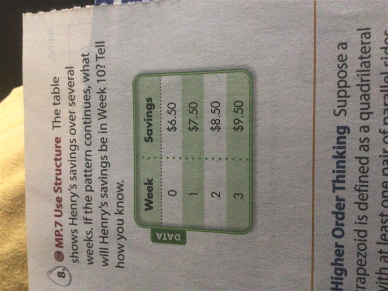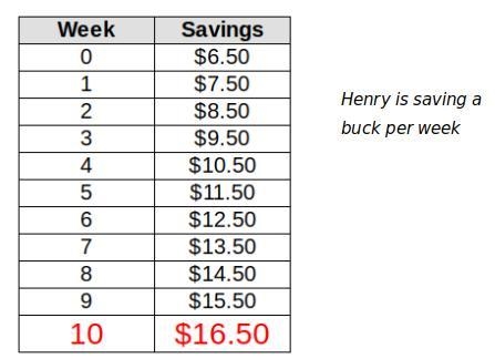 The table shows Henry's savings over several weeks. If the pattern continues, what will Henry's savings be in Week 10? Tell how you know. Week Savings
