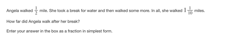 Angela walked 12 mile. She took a break for water and then walked some more. In all, she walked 1110 miles. How far did Angela walk after her break? Enter your answer in the box…