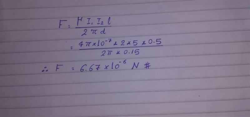 find the force between 2 wires 0.50m long, if there is 0.15m between them and the first wire has 2.0a, and the second wire carries 5.0a.