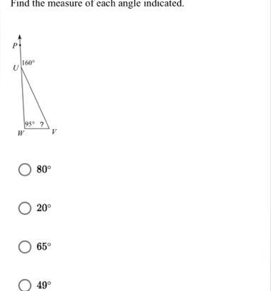 Find the measure of each angle indicated. P U 160° W 95° ? V-example-1