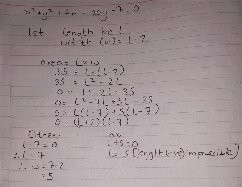 The width of a rectangle is the length minus 2 units . The area of the rectangle is 35 square units . What is the length , in units , of the Rectangle