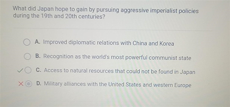 Question 8 of 10 What did Japan hope to gain by pursuing aggressive imperialist policies during the 19th and 20th centuries? O A. Improved diplomatic relations with China and Korea OB. Recognition as the world's most powerful communist state OC. Military alliances with the United States and western Europe O D. Access to natural resources that could not be found in Japan SUBMIT