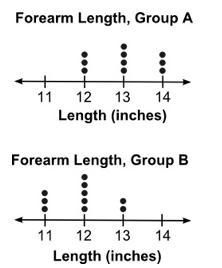The two dot plots below compare the forearm lengths of two groups of schoolchildren: