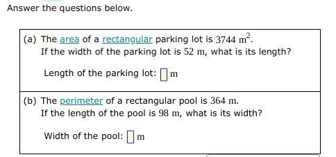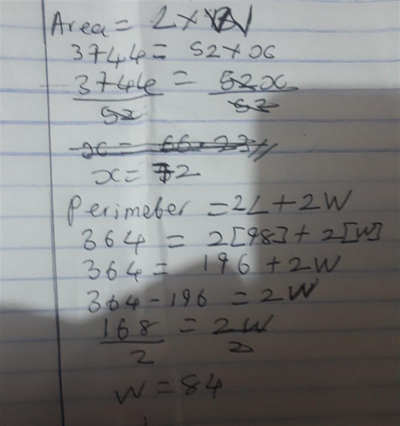 b) P = 2L x 2W 364 = 2(98) + 2W 364 = 196 + 2W