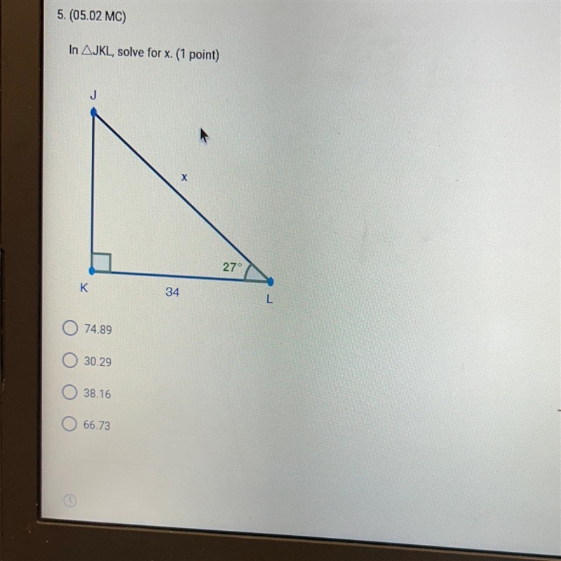 Use the information I provided below and your own knowledge to finish. I'm not sure were to go from here, but maybe it has something to do with the 90 degree angle and the other two I just figured out?? I know it has to do with the provided leg, 34, but don't know how to calculate the other to find the hypotenuse, x.