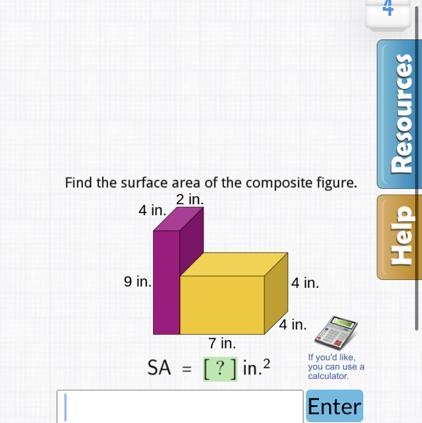 Find the surface area of the composite figure. 2 in. 4 in. 9 in. SA = 7 in. 2 [?] in-example-1