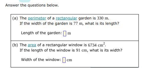 You want the length of a garden with a perimeter of 330 m and a width of 77 m, and you want the width of a window with an area of 6734 cm² and a length of 91 cm.