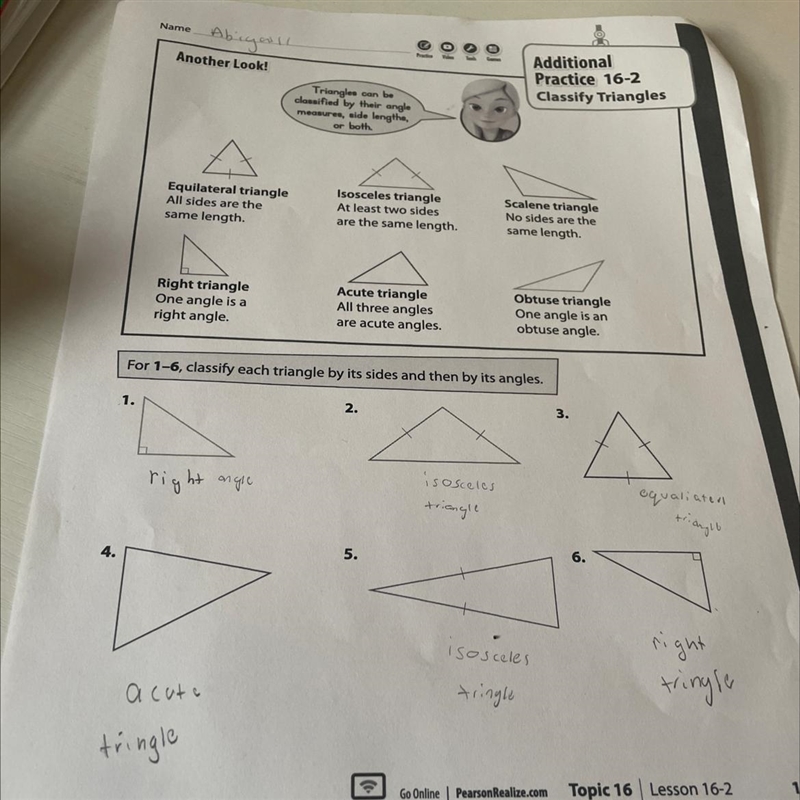 Hello! are these correct? if you can not see my answers : 1. right triangle 2. isosceles triangle 3. equilateral triangle 4. acute triangle 5. isosceles triangle 6. right triang…