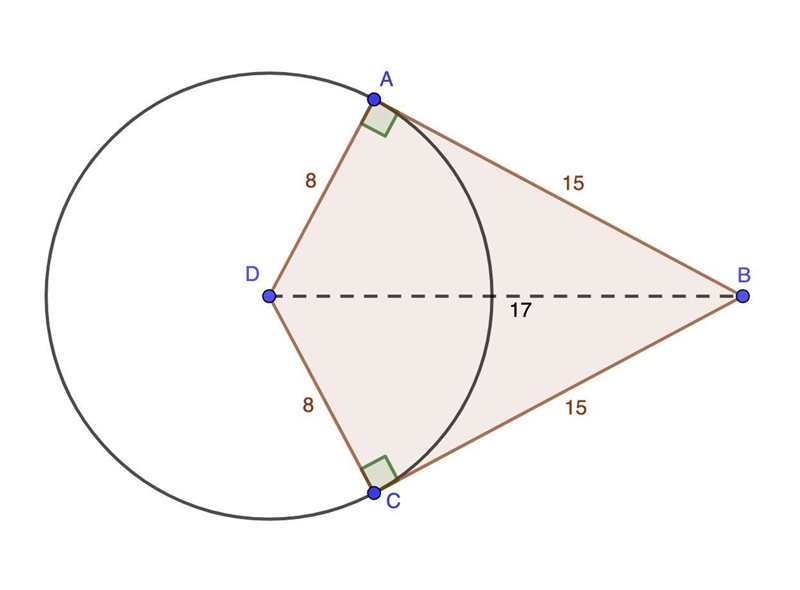 The attachment shows the figure. Radii DA and DC are perpendicular to the tangens, so each triangle is a right triangle. The hypotenuse BD is given as 17 inches, and the leg AB is given as 15 inches. The other leg is found from the Pythagorean theorem (or from your knowledge of Pythagorean triples). It is ...