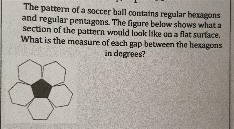The pattern of a soccer ball contains regular hexagons and regular pentagons. The figure below shows what a section of the pattern would look like on a flat surface. What is the measure of each gap between the hexagons in degrees?​